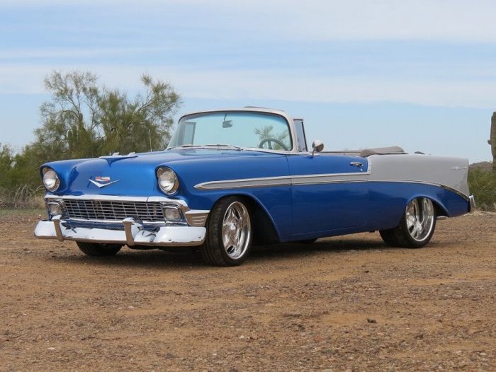 1956 Chevrolet Belair Convertible. 454 Big Block Chevy Bored to 468 CI. Original frame, boxed and original steel body, Power Top, PPG Paint, Edelbrock Dual Quads w/Edelbrock Intake, Valve Covers & Air Cleaner , Stainless Exhaust w/Flowmaster 50 Series Mufflers , Hot Rods By Dean Gen 1, Core Support Cooling Module , Vintage Air Front Runner Belt System , Hughes 700R4 Transmission , ABS Electric Power Master Cylinder , CPP, Steering Box 14:1 Ratio , CPP Drop Spindle w/Disc Brake , Front Lowering Springs , Leaf Spring Rear w/Lowering Blocks , Bilstein Shocks , Currie, Ford 9 3:50 Ratio 3 Spline w/Tru-Trac Differential , Rock Valley 28 Gallon Fuel Tank , Schott Velocity Wheels 18×7 and 20×12 , Michelin Pilot Super Sport 225/78 and 335/30 , Kip Kuiper Custom Interior , Finished Trunk , Vintage Air A/C , Lokar Pedals , Gennie Lo-Stick Shifter , Ididit, Tilt Steering Column w/14 LeCarra Steering Wheel , Autometer Tach, Oil Pressure and Temp Gauges , Original Speed-o and Fuel Gauge in working Condition , Retro Look Stereo w/Amp and Sub , Cruise Control , Foldaway GPS .