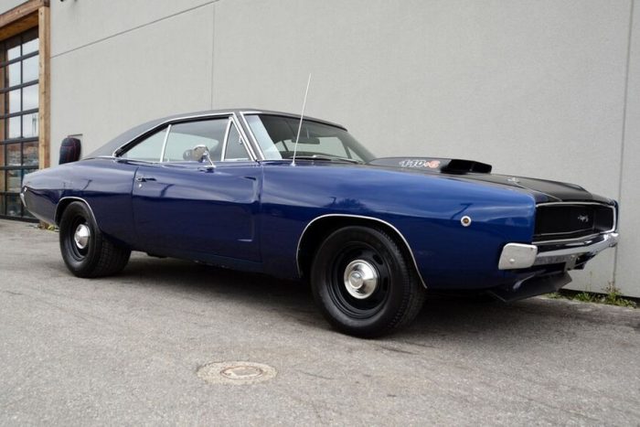 This 1968 Dodge Charger was produced at Chrysler’s Hamtramck, Michigan facility. Gauge cluster has been updated with new gauges 17,892 Miles shown (5 Digit ODO TMU). Well equipped with Vinyl seats, Autometer Sport-Comp gauges, Custom gauge bezel, Hurst shifter, Matte black hood with 6 pack scoop, Hide away headlights, HID Headlight bulbs, 15″ wheels with 15.5″ wide Hoosier Pro Street rear tires. 440Ci V8 Magnum mated to a 4 speed manual transmission rated by the factory when new at 375hp / 483lb-ft.