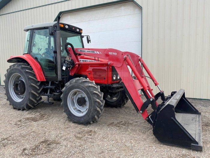 2004 MASSEY FERGUSON 5445 TRACTOR W/ MF 1070 LOADER, SAME AS NEW, 305 HOURS, 4X4, 3 POINT, 540 PTO, 2 REAR REMOTES, HEAT & A/C, CAB, 305 HOURS, 4X4, 3 POINT, 540 PTO, 2 REAR REMOTES, DRAWBAR, HEAT & A/C, LHR, 16F/16R GEARED TRANMISSION, 85 HP PERKINS PRE-EMISSIONS DIESEL ENGINE, 9,305 LB OPERATING WEIGHT, MF 1070 LOADER W/ 84″ BUCKET, 13.6R24 FRONT TIRES, 16.9R34 REAR TIRES, FRESH SERVICE & MULTI-POINT INSPECTION COMPLETED BY A CERTIFIED TECHNICIAN.