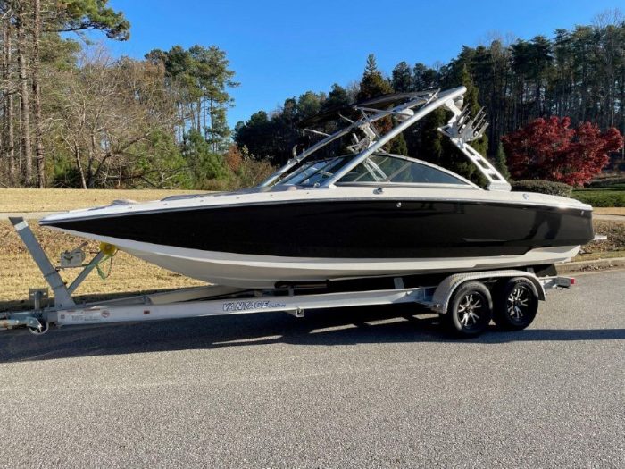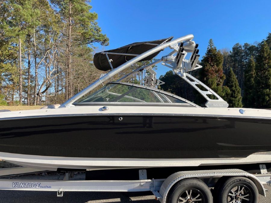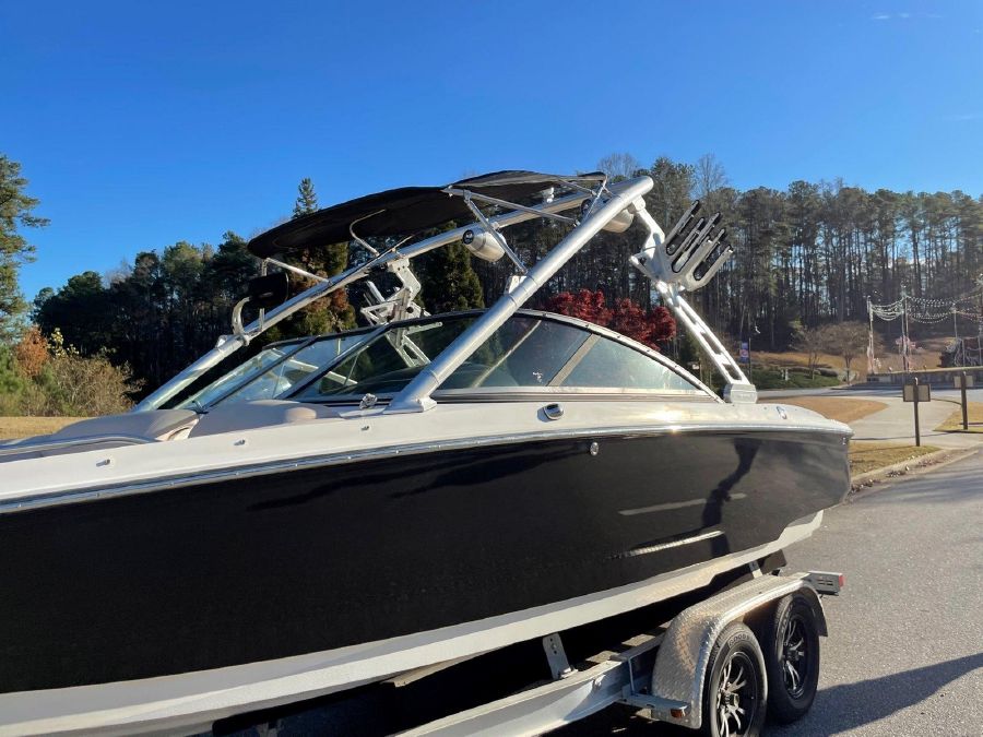 Wakeboarding enthusiasts will have a difficult time finding a more accommodating boat than the X-Star. The boat’s unique hull deserves much of the credit for both the exhilarating wake and the comfortable ride of the boat. The AP-1 (Anything’s Possible) hull’s four terraced chines have been designed to manipulate and enhance wake shape. Located at the helm console, the X-Pod is a bullet-shaped configuration of billet aluminum gauges that suspend the speedometer, tachometer and Perfect Pass cruise control in full view of the driver. At the center of the boat, you’ll find wrap-around seating covered in dense 34 ounce vinyl. All of the seats have storage space underneath, and the observer’s seat (opposite the driver) flips up for storage, forming a dual access compartment that is accessible from the bow or amidships. The X-Star has been the best-selling boat in MasterCraft’s 35 year history, so everyone at the company was understandably nervous about taking part in such a radical redesign, but they are confident that they have given their customers and prospective buyers exactly what they want: a no-nonsense wakeboarding boat that looks and rides like a dream.