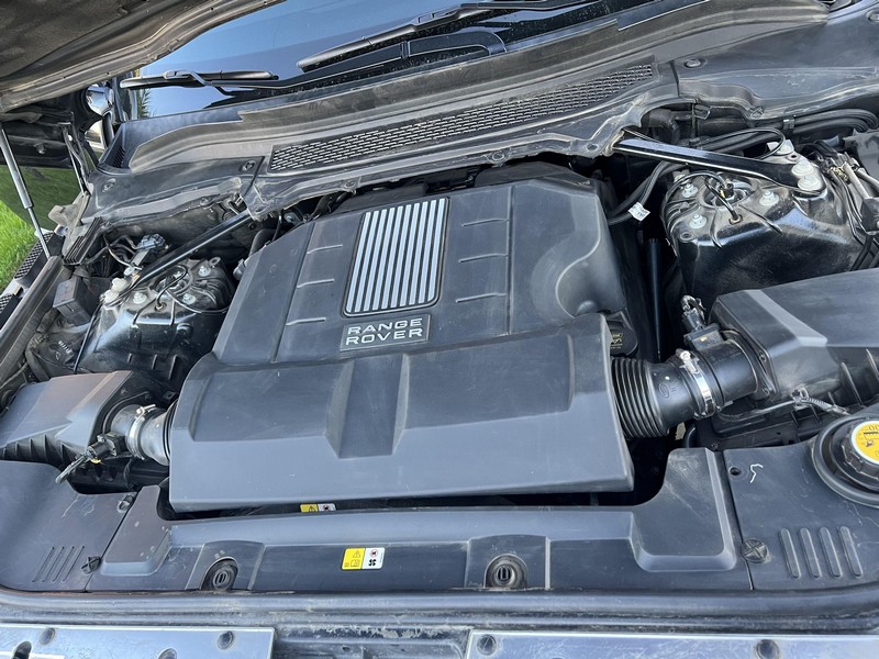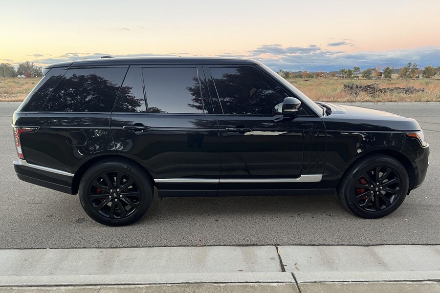 THIS… is a 2013 Range Rover HSE, finished in black with an Ebony interior. The attached Carfax history report shows this Land Rover has been California-owned since new. Factory equipment includes 20-inch wheels, a height-adjustable air suspension system, a sunroof, heated and power-adjustable front seats, heated rear seats, a 12.3-inch digital instrument cluster, and a Meridian sound system. Modifications reported by the seller include a black finish on the wheels, red-painted brake calipers, and tinted windows. Power comes from a 5.0-liter V8, rated at 375 horsepower and 375 lb-ft of torque. It spins the four wheels via an 8-speed automatic transmission and a 2-speed transfer case.