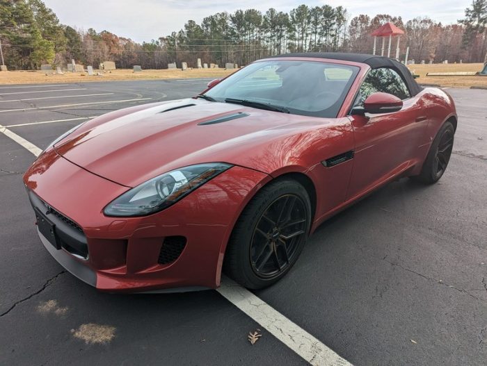 Modifications reported by the seller include a Velocity AP Stage 2 ECU tune and crank pulley, 18-inch Fast Wheels Aristo wheels, Eibach 15mm rear wheel spacers, gloss black hood and side vents, and red carbon fiber interior trim. A set of factory wheels and the removed trim components are included with the sale. Power comes from a 3.0-liter supercharged V6, rated at 340 horsepower and 332 lb-ft of torque. Due to the modifications performed to this F-Type, it may produce more power, but a dyno sheet was not provided to confirm. Output is sent to the rear wheels via an 8-speed automatic transmission.