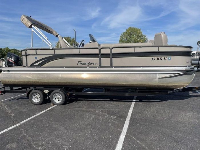Color: Tan/Black; Equipment Includes- Full Mooring Cover, Complete Sea Grass Floor, Hammered Rails, AM/FM Bluetooth Stereo w/Subwoofer and 6-Speakers, Raised Driver Platform, Humminbird 175 Fish/Depth Finder, Trash Door Installed On Lounge Arm, Mid-Ship Cleats, Docking Lights, Pop-Up Changing Room, In-Floor Ski Locker, Ski-Tow Bar and PTX Performance Package w/30″ Center Tube, 25″ Outer Tubes, In-Floor Ski Locker, Lifting Strakes, Performance Sheeting, 47 Gallon Fuel Tank and Hydraulic Steering.