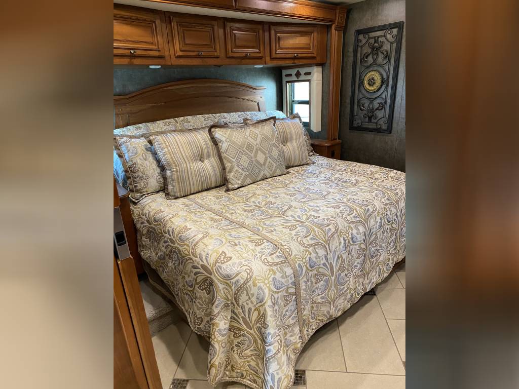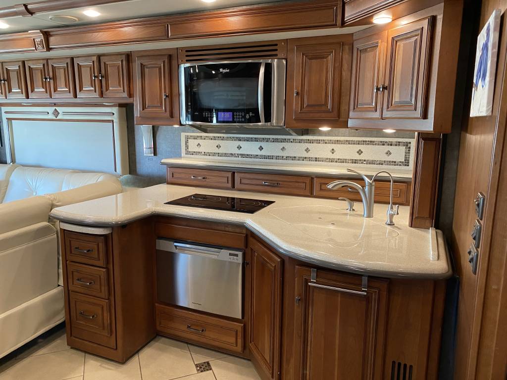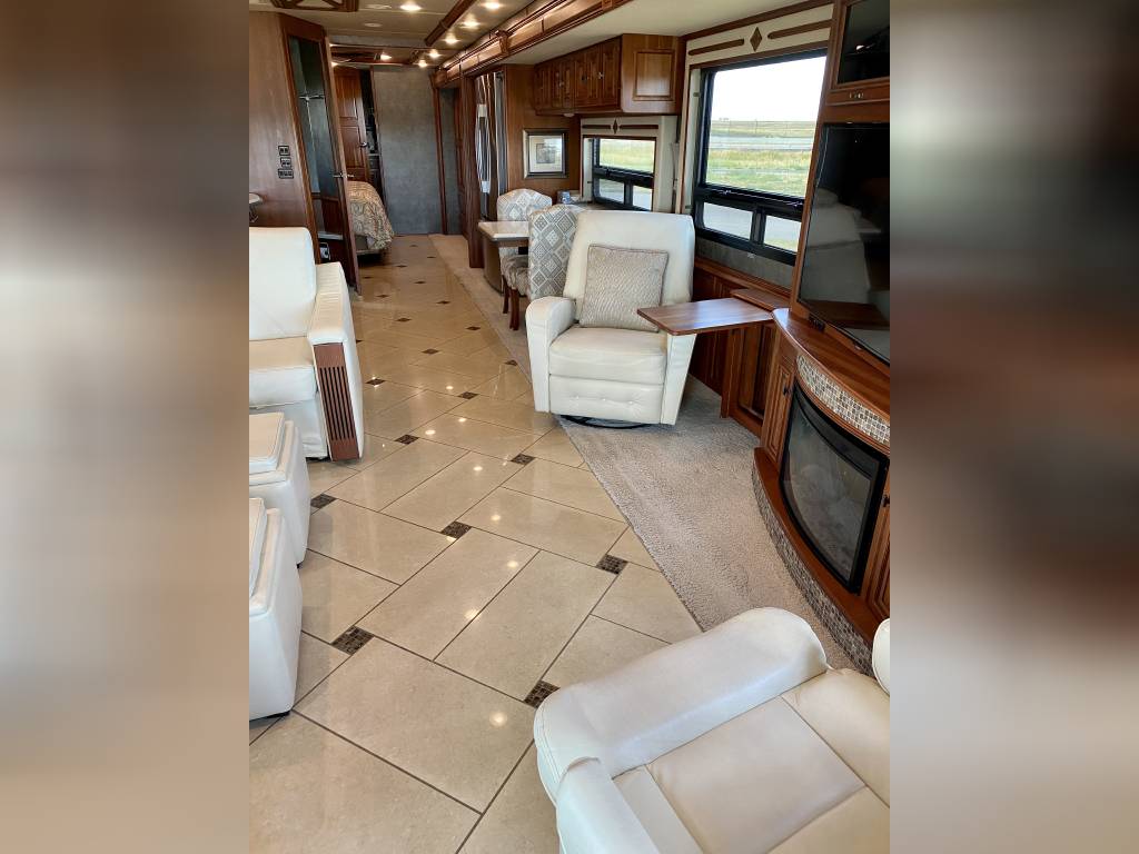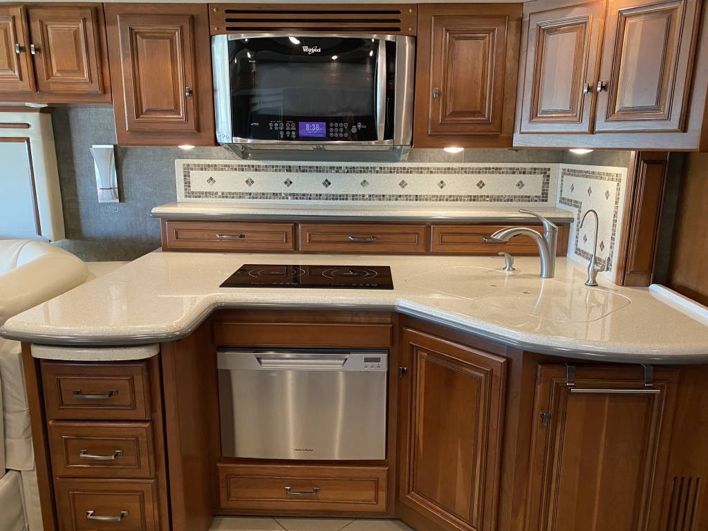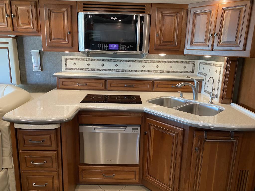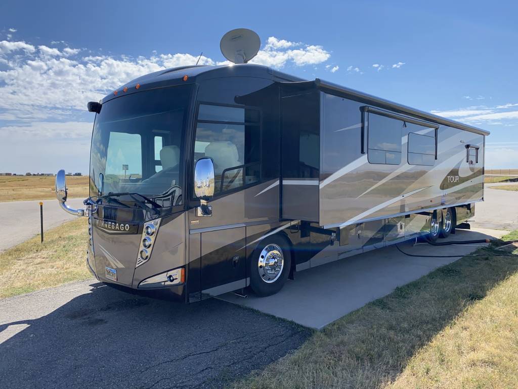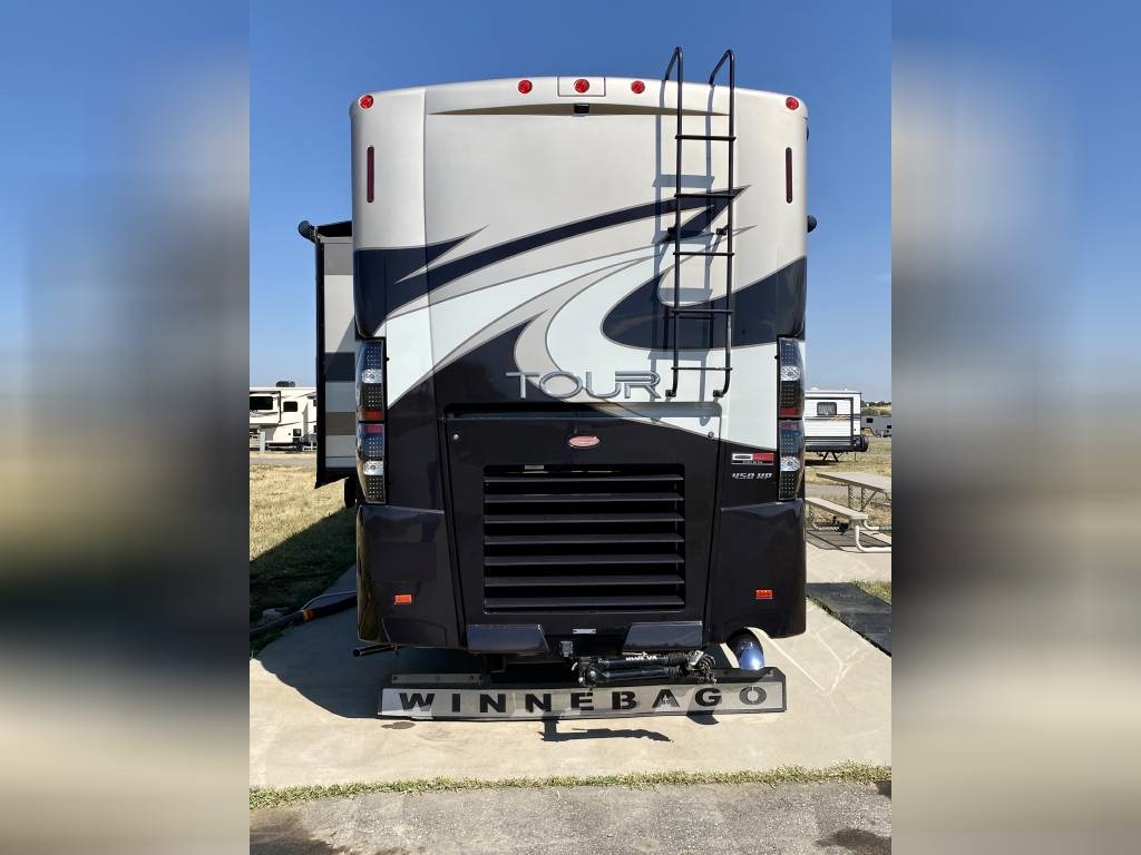 Discover like-new Class A Diesel 2014 Winnebago Tour 42QD. Immaculate condition inside and out. No pets, no smoking, no shoes (compulsively clean owners…)! Dedicated to annual maintenance per mfg. schedules with all service records available. There are many upgrades/optional features to this stunning coach, which include: coach and chassis batteries replaced (2020), tailgate package (with electric range top, refrigerator and storage compartment), Winegard SWM HD satellite TV system, slide covers replaced (2019), upgraded galley slide to more reliable power gear system (2018), upgraded kitchen faucet (2019) and showerhead (2021), front tires replaced (2018), stackable washer/dryer, tire covers for all tires. Inside, the Tour 42QD is all electric and has a highly desirable floor plan with a bath and a half. Standard features include Flexsteel captain’s chairs, recliner and J couch, porcelain tile on diagonal, solid surface Corian countertops with ornate mosaic stone/glass backsplash in kitchen and both bathrooms, cabinets, drawers and wood trim are stunning solid cherry. The coach features a full wall slide (driver’s side) and two slides on the passenger side, with a residential refrigerator/freezer with door water and ice dispenser, two televisions, microwave/convection oven, two-burner induction cooktop, drawer dishwasher, electric fireplace, 2 ottomans, and king-sized bed with air mattress. Has Aqua Hot 450D hydronic heating system for unlimited hot water. Outside, the Tour provides a double wide slide out bay, television on a swivel, three 13,500 BTU roof Coleman air conditions (two of which are heat pumps), an Onan 10kw diesel generator (less than 150 hours).