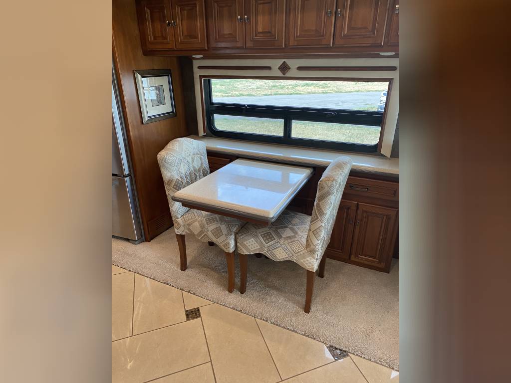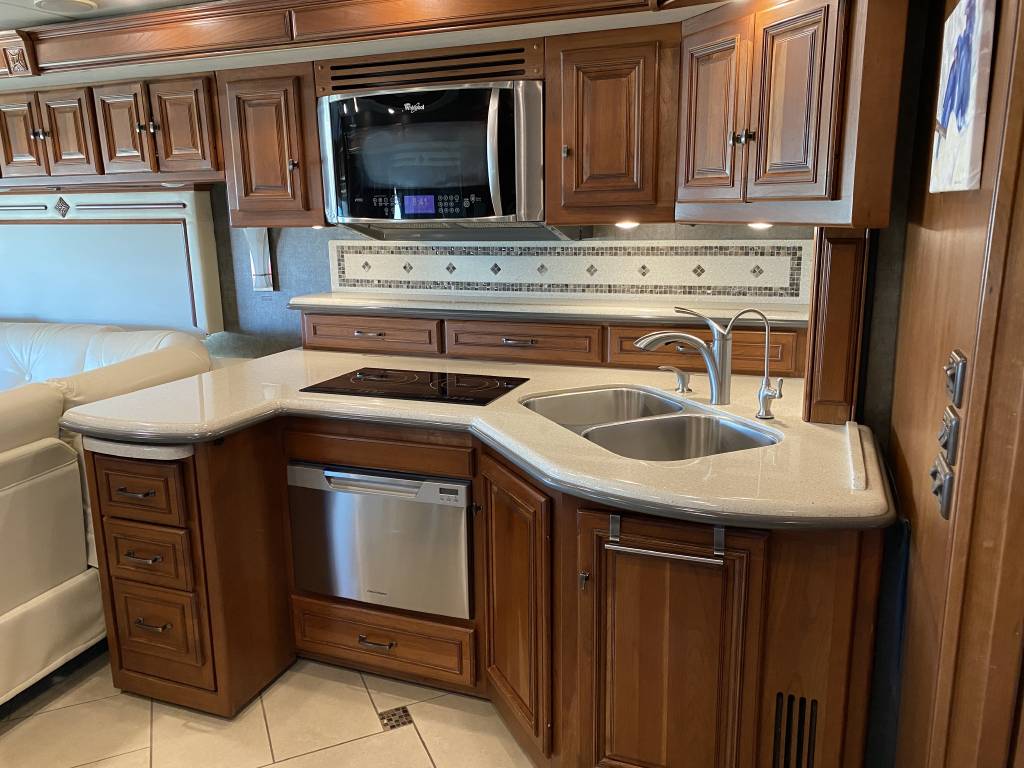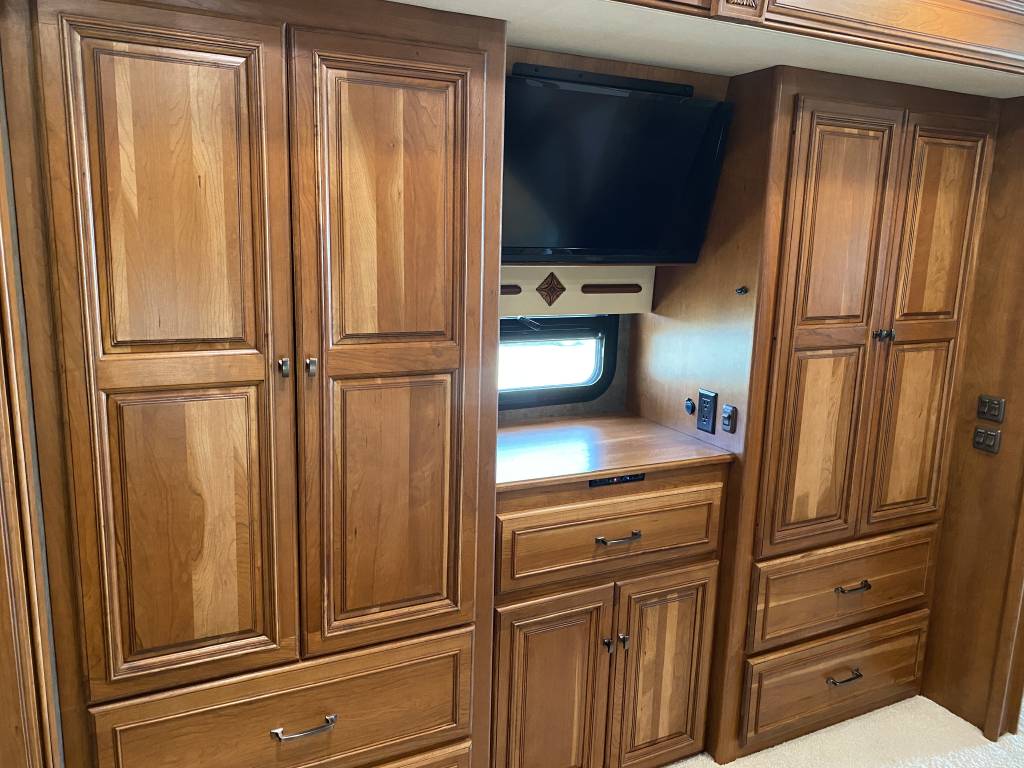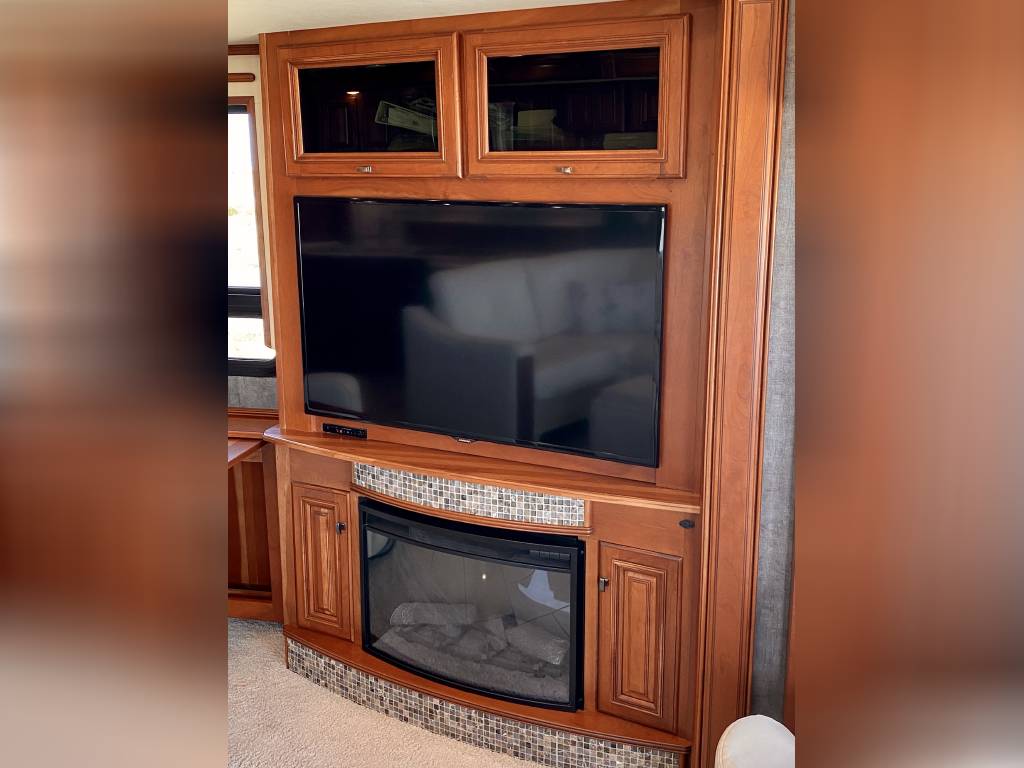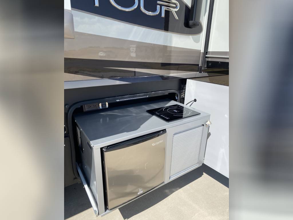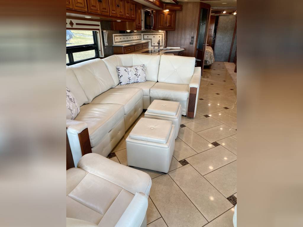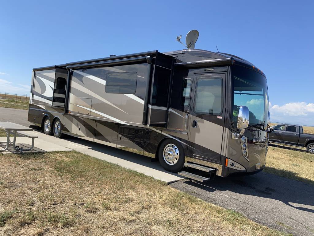Discover like-new Class A Diesel 2014 Winnebago Tour 42QD. Immaculate condition inside and out. No pets, no smoking, no shoes (compulsively clean owners…)! Dedicated to annual maintenance per mfg. schedules with all service records available. There are many upgrades/optional features to this stunning coach, which include: coach and chassis batteries replaced (2020), tailgate package (with electric range top, refrigerator and storage compartment), Winegard SWM HD satellite TV system, slide covers replaced (2019), upgraded galley slide to more reliable power gear system (2018), upgraded kitchen faucet (2019) and showerhead (2021), front tires replaced (2018), stackable washer/dryer, tire covers for all tires. Inside, the Tour 42QD is all electric and has a highly desirable floor plan with a bath and a half. Standard features include Flexsteel captain’s chairs, recliner and J couch, porcelain tile on diagonal, solid surface Corian countertops with ornate mosaic stone/glass backsplash in kitchen and both bathrooms, cabinets, drawers and wood trim are stunning solid cherry. The coach features a full wall slide (driver’s side) and two slides on the passenger side, with a residential refrigerator/freezer with door water and ice dispenser, two televisions, microwave/convection oven, two-burner induction cooktop, drawer dishwasher, electric fireplace, 2 ottomans, and king-sized bed with air mattress. Has Aqua Hot 450D hydronic heating system for unlimited hot water. Outside, the Tour provides a double wide slide out bay, television on a swivel, three 13,500 BTU roof Coleman air conditions (two of which are heat pumps), an Onan 10kw diesel generator (less than 150 hours).