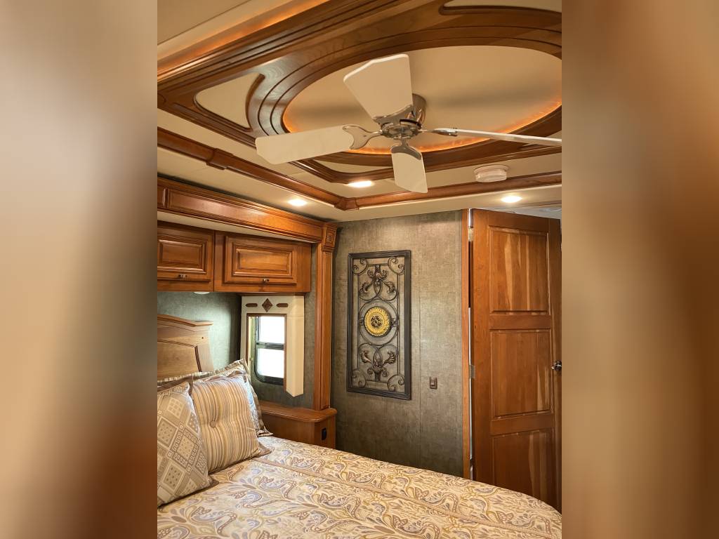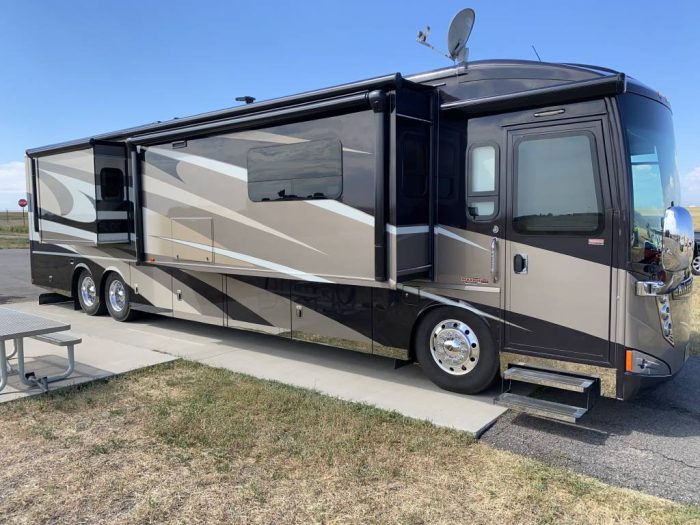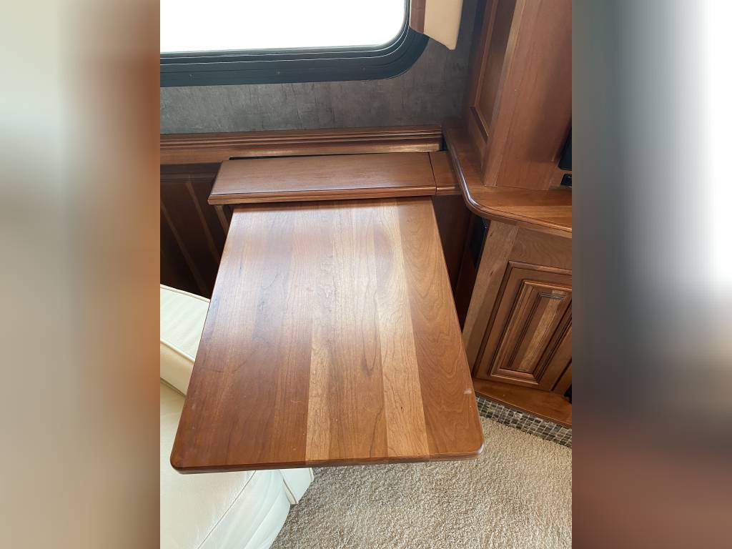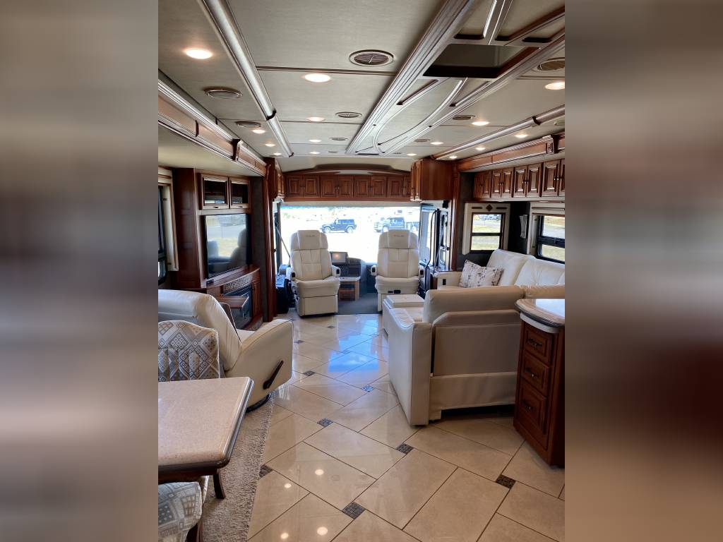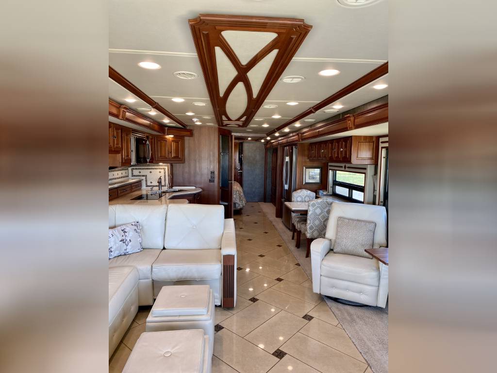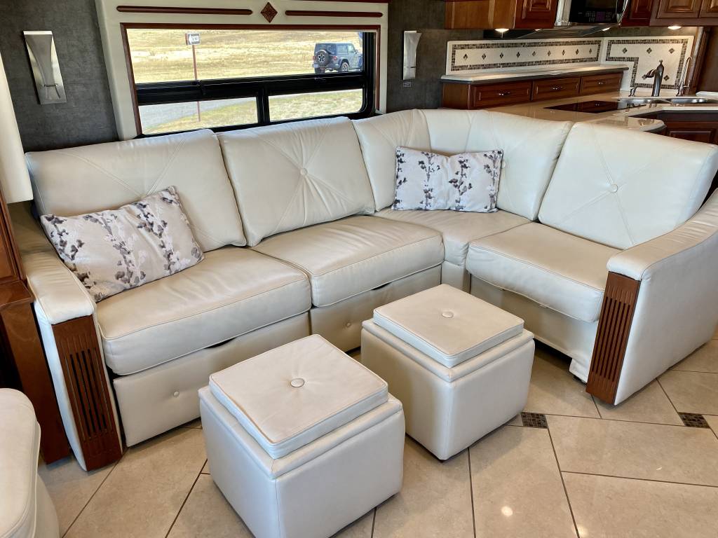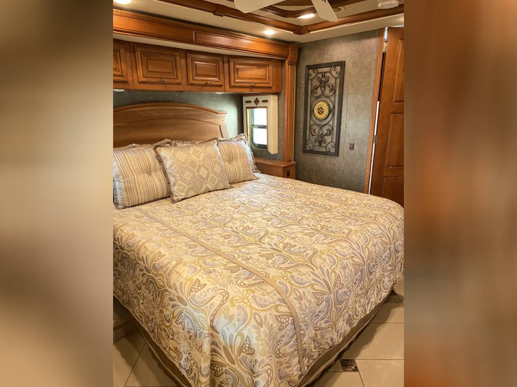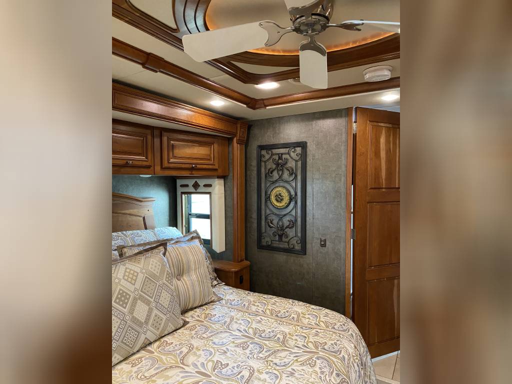 Discover like-new Class A Diesel 2014 Winnebago Tour 42QD. Immaculate condition inside and out. No pets, no smoking, no shoes (compulsively clean owners…)! Dedicated to annual maintenance per mfg. schedules with all service records available. There are many upgrades/optional features to this stunning coach, which include: coach and chassis batteries replaced (2020), tailgate package (with electric range top, refrigerator and storage compartment), Winegard SWM HD satellite TV system, slide covers replaced (2019), upgraded galley slide to more reliable power gear system (2018), upgraded kitchen faucet (2019) and showerhead (2021), front tires replaced (2018), stackable washer/dryer, tire covers for all tires. Inside, the Tour 42QD is all electric and has a highly desirable floor plan with a bath and a half. Standard features include Flexsteel captain’s chairs, recliner and J couch, porcelain tile on diagonal, solid surface Corian countertops with ornate mosaic stone/glass backsplash in kitchen and both bathrooms, cabinets, drawers and wood trim are stunning solid cherry. The coach features a full wall slide (driver’s side) and two slides on the passenger side, with a residential refrigerator/freezer with door water and ice dispenser, two televisions, microwave/convection oven, two-burner induction cooktop, drawer dishwasher, electric fireplace, 2 ottomans, and king-sized bed with air mattress. Has Aqua Hot 450D hydronic heating system for unlimited hot water. Outside, the Tour provides a double wide slide out bay, television on a swivel, three 13,500 BTU roof Coleman air conditions (two of which are heat pumps), an Onan 10kw diesel generator (less than 150 hours).
