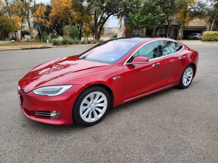 THIS… is a 2017 Tesla Model S 100D, finished in red with an Ultra White interior. It also shows that this Model S is a one-owner car that has been Texas-owned since new. Factory equipment includes the Subzero Weather Package, 19-inch “Slipstream” wheels, an air suspension system, a glass roof, dark ash wood interior trim, heated and power-adjustable front seats, a 17-inch touchscreen for the infotainment system, the Ultra High Fidelity Sound Package, and Enhanced Autopilot technology. The only modification reported by the seller is a 64-gigabyte MMC daughterboard. Power comes from a pair of electric motors, which draw electricity from a 100-kilowatt-hour lithium-ion battery pack to zap the four wheels with 523 horsepower and 487 lb-ft of torque, according to third-party estimates. In 2017, the EPA gave the 100D variant a maximum driving range rating of 335 miles.