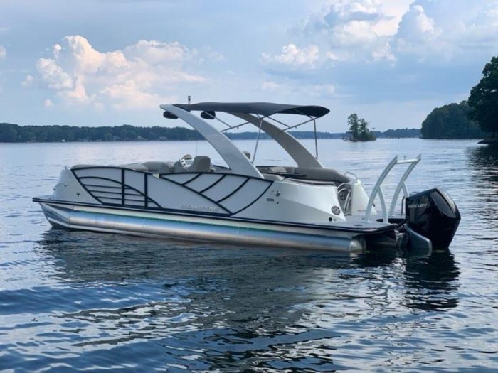 FEATURE OPTIONS FOR THIS INCLUDE: TOP EXTERIOR PANEL COLOR – PEARL WHITE, BOTTOM EXTERIOR COLOR – PEARL WHITE, FURNITURE ACCENT COLOR – TAUPE, FURNITURE BASE VINYL COLOR – FLAGSTONE, SPORT SERIES LIGHTED CUPHOLDERS, RBB EXTERIOR RAIL LIGHTS, LED UNDER DECK LIGHTS, RGB FLOOR, TABLE & SEAT BASE LIGHTS, FLOORING – GREY- TEAK 2 VINYL OPT, CANVAS – BLACK ONYX, STRIPE COLOR – NO STRIPE, SKI TOW – PEARL WHITE, ARCH COLOR – PEARL WHITE, “BLACK OUT” TRIM PACKAGE BLACK ANODIZED RAILS, BLACK ANODIZED BIMINI TOP FRAME, BLACK RAIN SPACERS, BLACK PINCH GUARDS, BLACK DOOR STOPS, BLACK RAIL PLUGS, BLACK ANODIZED DECK TRIM, BLACK SPLICE COVERS, BLACK RUB RAIL, BLACK CORNER PADS, BLACK SNAP SCREWS, BLACK TABLE LEG & BASE, (2) CAN SPEAKERS MOUNTED ON ARCH, RGV LED UNDEWATER LIGHTING, TEAK 2 VINYL FLOOR UPGRADE, USB PORTS (1) PAIR IN BOW.