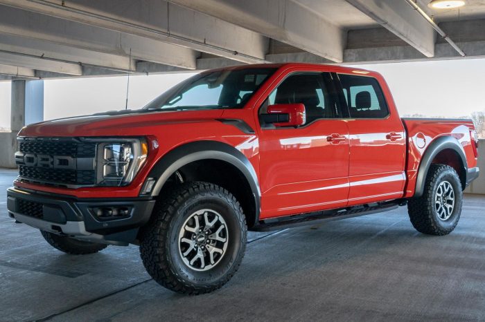 THIS… is a 2021 Ford F-150 Raptor, finished in Code Orange Metallic with a black interior. The attached Carfax history report lists no accidents or damage in this truck’s past. Factory equipment includes the Power Tech and Raptor Carbon packages, an 18-speaker Bang & Olufsen audio system, 17-inch wheels, a Raptor-specific off-road suspension system, skid plates, running boards, a trailer hitch, heated and ventilated front seats, a 360-degree camera system, and rear parking sensors. Modifications reported by the seller are limited to Decked bed drawers and Line-X spray-in bed liner. Designed to speed across the desert Baja racing-style, the third-generation F-150 Raptor made its debut for the 2021 model year. In addition to styling changes, Ford upgraded the rear suspension to a coil-spring setup to replace the old leaf springs. Additionally, the new Raptor gets a fully digital instrument cluster, a 12-inch touchscreen infotainment system, and a shift lever that folds flat into the center console area. Power for this Raptor comes from a turbocharged 3.5-liter “EcoBoost” V6, which produces 450 horsepower and 510 lb-ft of torque. The engine spins the 4 wheels via a 10-speed automatic transmission linked to a pair of shift paddles and a 2-speed transfer case.